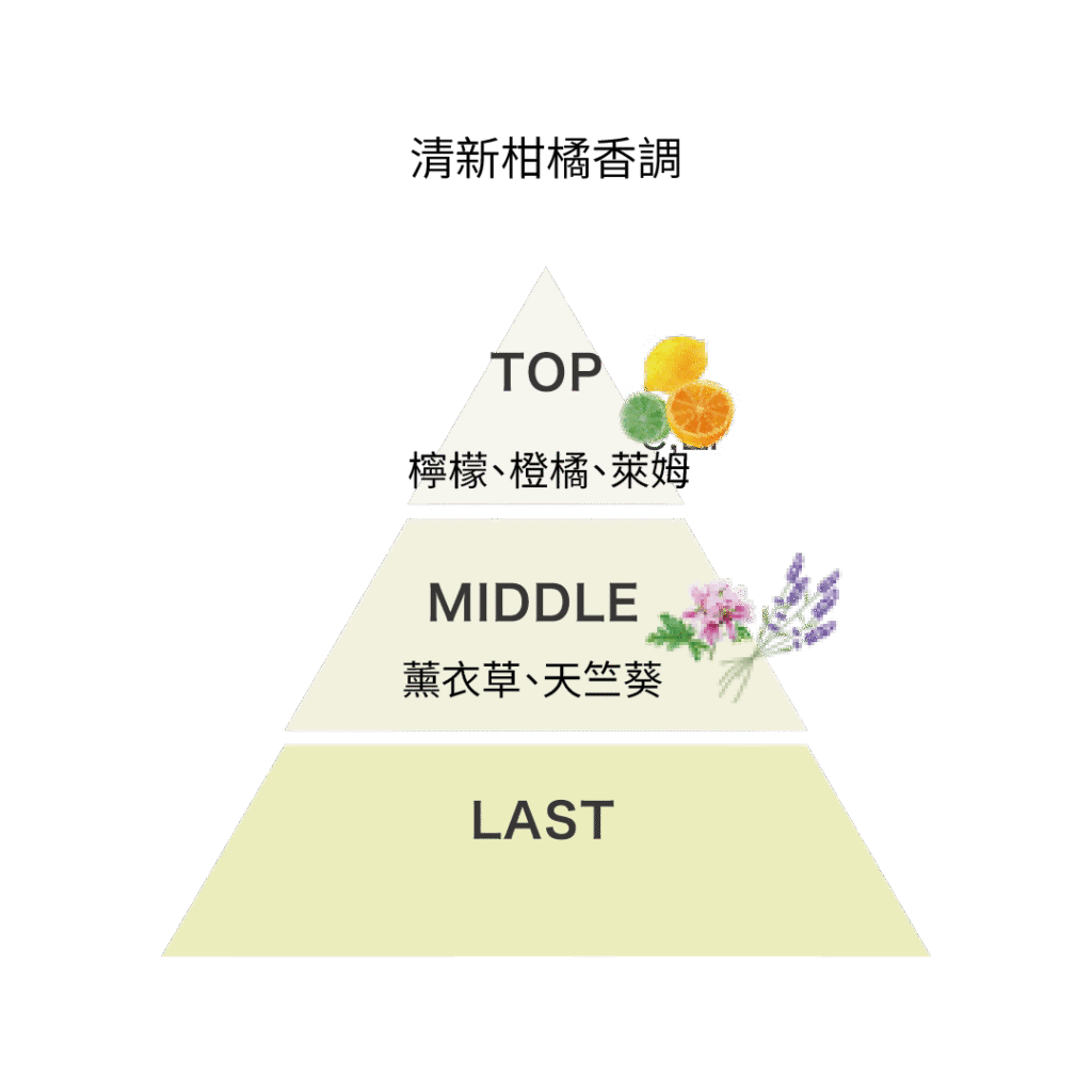 • 天然精油:檸檬果皮油、甜橙果皮油、萊姆油、印度檸檬香茅油、雜交薰衣草油、樟樹葉油、香葉天竺葵葉油