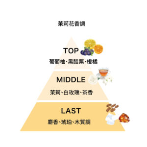 以玫瑰為核心的花香交織出優美樂章,點綴閃耀柑橘與蘋果的華美高雅香氣。
