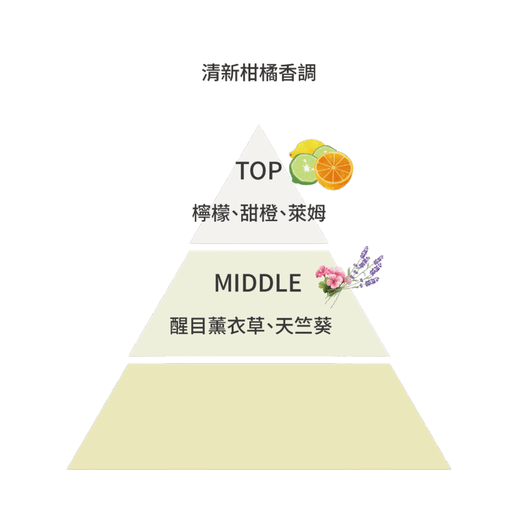 • 天然精油:檸檬果實油、甜橙果皮油、萊姆油、印度檸檬香茅油、雜交薰衣草油、樟樹葉油、香叶天竺葵葉油
