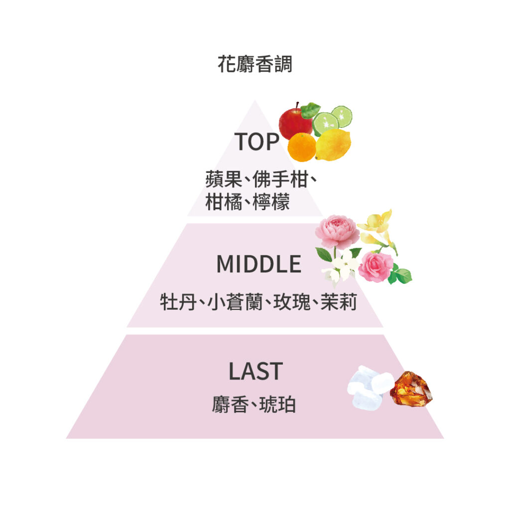 前調綻放蘋果與佛手柑的果物清甜,中調迎來玫瑰與牡丹的華麗花香,後調則由麝香與琥珀溫柔交融,留下溫潤高雅的綿長餘韻。