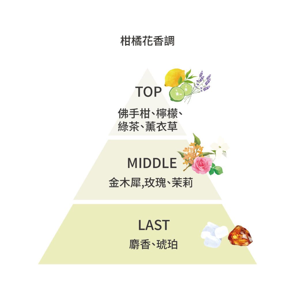 融合清新檸檬的爽朗氣息,並點綴迷迭香與薰衣草的柔甜香味,營造出明亮華麗的香氛印象。